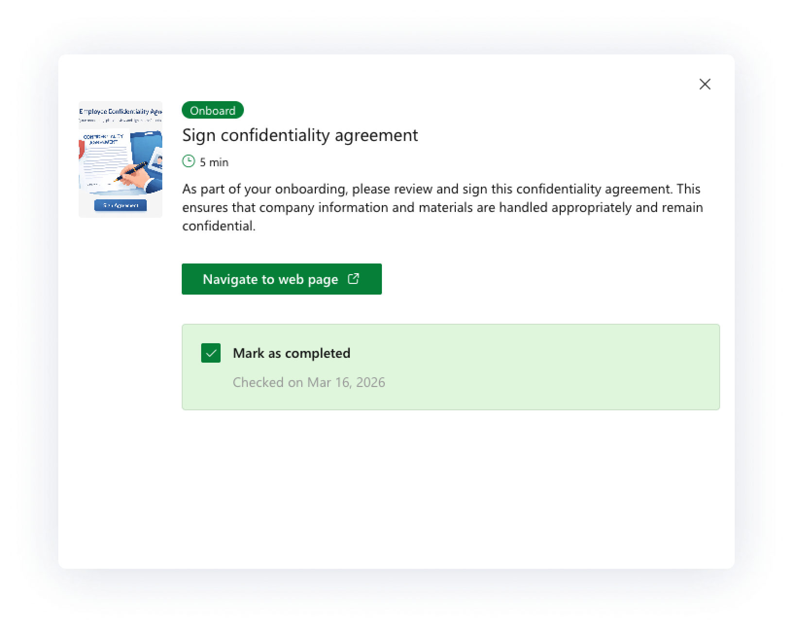 This update to the Inform and Onboard Widget makes the experience easier to follow for users, and easier to manage for admins. Clearer actions, less clutter in the list, and a completion flow that feels more satisfying when you tick something off.