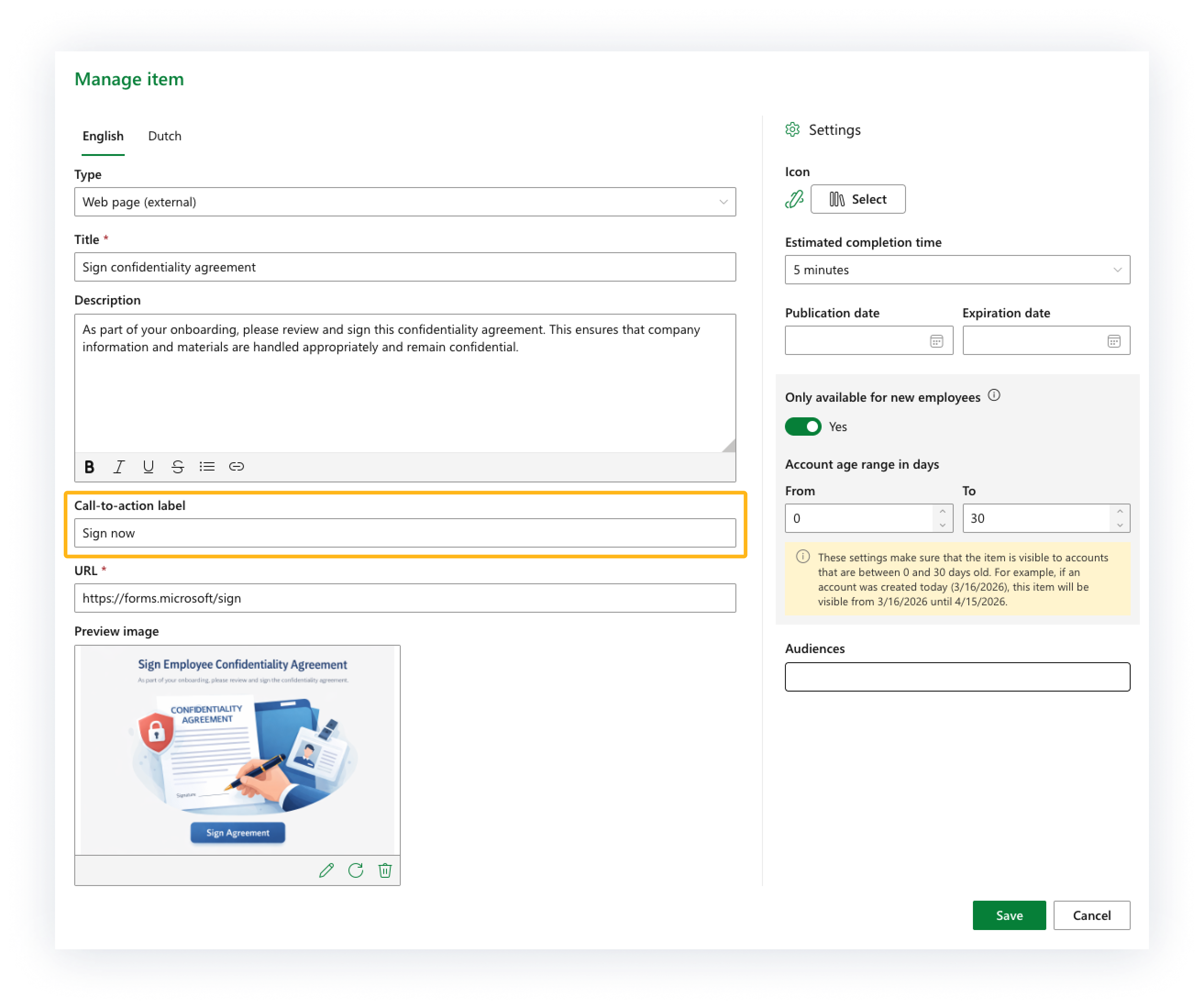 You can also hide the call to action in the list view when you want a cleaner overview. And items that are scheduled for later publication can stay out of sight until they are relevant, so users only see what they can act on right now.