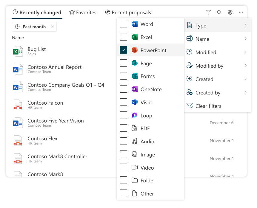 The new filter icon in the widget header lets you easily search for files within a tab. You can filter your results by Type, Name, Modified, Modified by, Created, and Created by. To remove a filter, use the small visual representation of the filter, located just above the content.